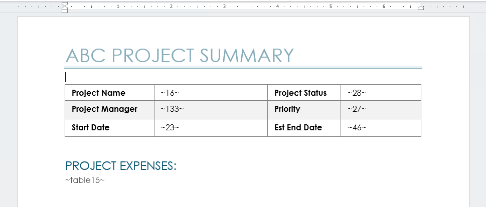 Get field id of field from table and place them between "~" sign on template where you want value of that field to displayed on document