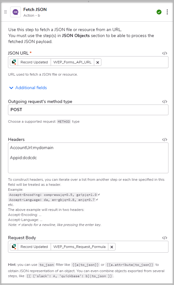 & "&:mrg="&Dbid()&"|"&[Record ID#]&"|19|pdf|Completed Package|128" - Create pipeline for WEP Forms API. You can use “Fetch JSON” under “JSON Handler” channel.