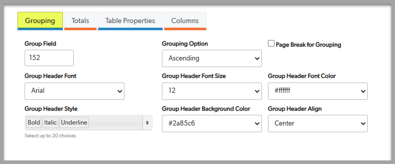 Group Header Font Size | Numeric | Font size for grouping header. Use integer numeric value (No decimals) |