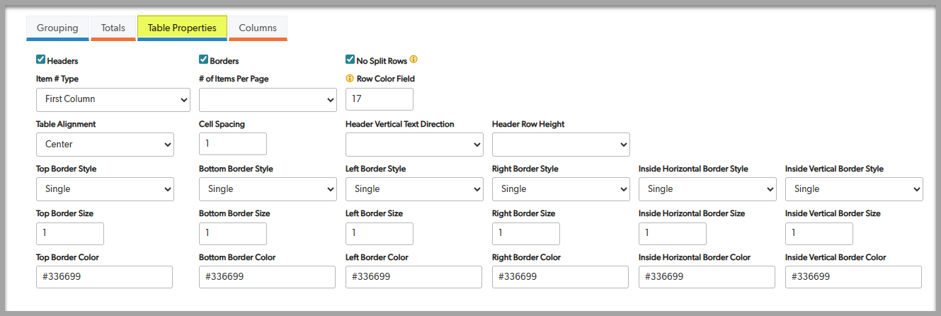 No Split Rows | Checkbox | Select this to prevent rows split into two pages. If last row on page doesn't fit on that page, it will start on second page. |