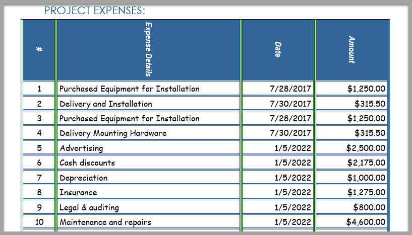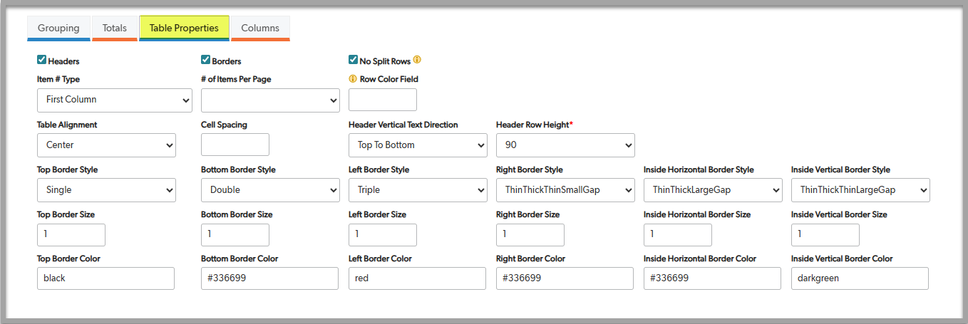 Settings 2: Below shows same table with different properties fields' values in WEP Table record under Table Properties tab. Headers are in vertical format and different border styles and colors selected.